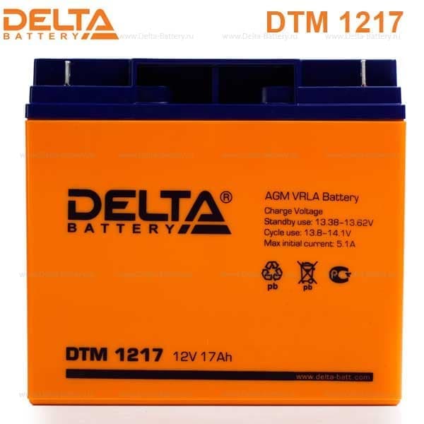 Герметизированный VRLA cвинцово-кислотный аккумулятор Delta DTM 1217 напряжением 12В и емкостью 17Ач изготовлен по технологии AGM (с микропористым заполнителем, пропитанным электролитом). Корпус изготовлен из негорючего ABS пластика. Срок службы аккумулятора достигает 6 лет. Аккумулятор предназначен для работы в режиме постоянного подзаряда (буферный режим) или в режиме разряд-заряд (циклический режим). Обладает низким внутренним сопротивлением и саморазрядом.